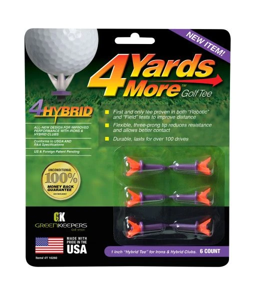 4 Yards More Golf Tees is the only tee scientifically proven in robotic and field tests to out distance the wood tee. Flexible, six-prong tip reduces resistance and allows for better contact. 4 Yards More is committed to the evolution of performance tees.